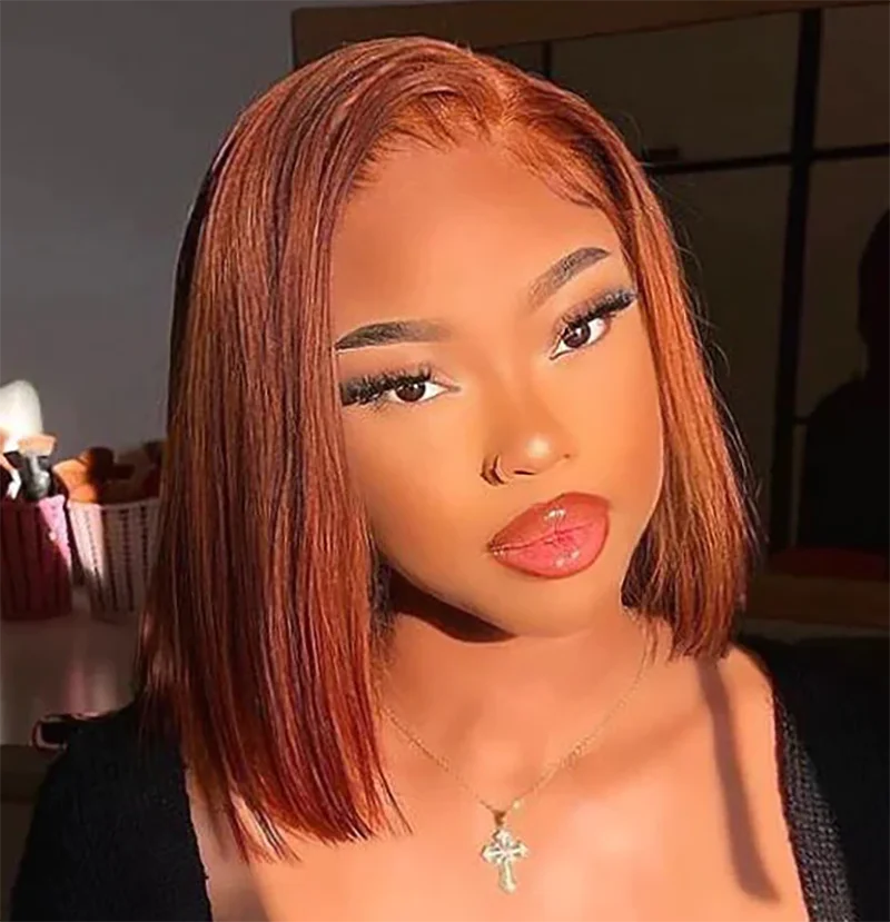 Peruca Bob Lisa Castanho Avermelhado #33 – Cabelo Humano, Frente de Renda, Sem Cola, Wear & Go, Pré-Cortada e Pré-Desbastada